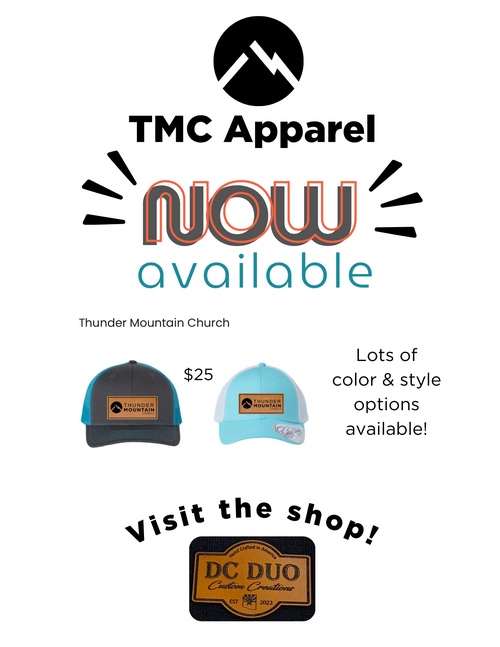 You've asked & we're excited to share TMC Apparel is here! Thanks to our friends at DC Duo Custom Creations, you can now choose from a variety of styles and colors of Thunder Mountain Church hats!