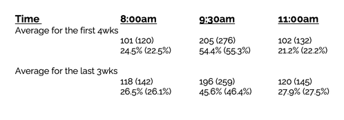Already the percentage of people attending at 9:30 has dropped from 55% to 46% and that drop improves our potential 81 adults and 23 children!