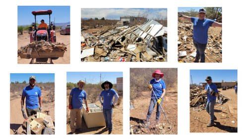 The Sheriff's Department Care Team reached out to us to gain our help with a massive clean-up project. We had over 25 people show up to help! The county provided two 40 yard roll-off containers and we filled them both to the max! Will Silva and Mark Goodman brought their tractors to bear. We could never have taken this on without their equipment and operating skills. And without those two containers from the county, this would have been all but impossible.